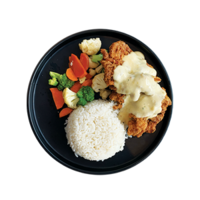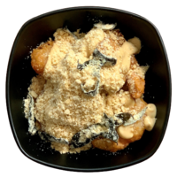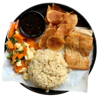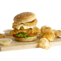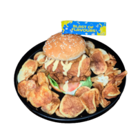 Particularly satisfying dish for the bread hunters! Dish is served with our fragrant sesame buns, paired with our freshly battered protein and onion fritters and drizzled with our signature sauce.