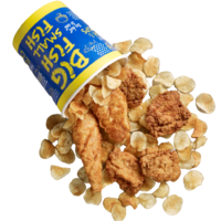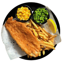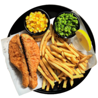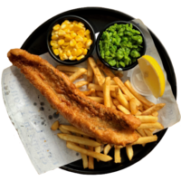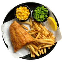 A traditional British hot dish, consisting of a fried fish in batter and served with golden fries made from imported potatoes. Dish will be served with mushy peas, corn and signature Tartar sauce.